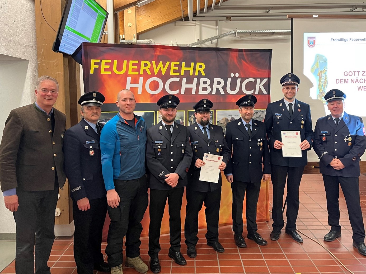 Bürgermeister Dr. Dietmar Gruchmann bedankte sich für die geleistete ehrenamtliche Arbeit, sowohl im feuerwehrtechnischen, als auch im gesellschaftlichen Bereich. Besonders erwähnte er dabei die Durchführung einer Sammelaktion für die Ukraine und die Unterstützung bei den Vorbereitungen für einen möglichen Blackout. Das Hochbrücker Feuerwehrhaus sei dabei ein „Leuchtturm“ für die Bevölkerung mit Notstromversorgung und unabhängiger Heizung. Auch der Hochbrücker Maibaum und das Brückenfest seien ohne die Feuerwehr nicht denkbar.